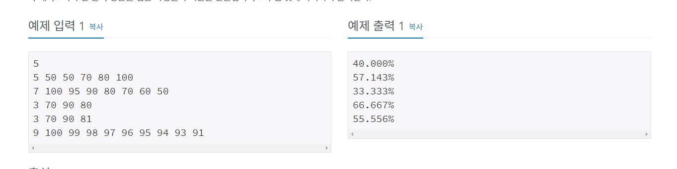 위의 문제의 출력예제의 첫째 줄을 보면 40%인 경우에도 소수점 셋째 자리(40.000%)까지 출력해야 하기에 문자열 포맷팅으로 처리해야 합니다!